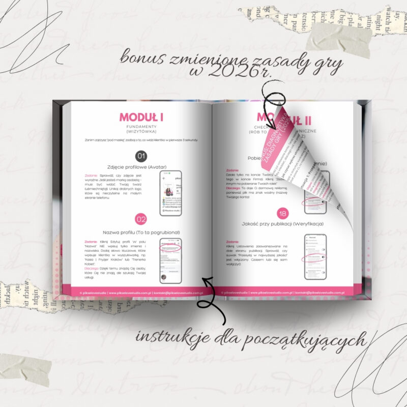 Twój Instagram nie sprzedaje? To prawdopodobnie wina ustawień, a nie Twoich zdjęć. Oto konkretna instrukcja “krok po kroku” dla totalnych laików. W środku znajdziesz 20 strategicznych ustawień, które musisz “odklikać”, aby odblokować zasięgi i przygotować konto na sprzedaż. Zero lania wody – same zrzuty ekranu, strzałki i proste polecenia. 🎁 BONUS: Diagnostyka rolek i nowe zasady gry na 2026 rok (B-roll vs. Nuda). Format: PDF (Natychmiastowe pobieranie).